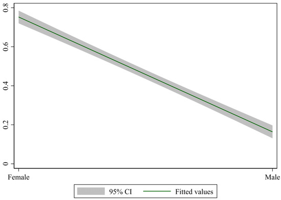 Based on correlation analysis, we fitted the relationship between gender and major selection among undergraduate students, as shown in Figure 1. In our sample, 344 female students (58.31% of total female students) chose applied majors, while 194 male students (33.79% of total male students) chose applied majors. As can be seen in Figure 1, gender influences the major choice differently among undergraduate students. The preliminary fitting results show that the probability of female students choosing applied majors is significantly higher than that of male students (the slope of the fitted line is between −0.64 and −0.54, R2 = 0.34). This result preliminarily indicates that there are gender differences in undergraduate students’ professional choices. Next, considering the differences in family background and academic performance between male and female students, we conducted a more rigorous econometric analysis.