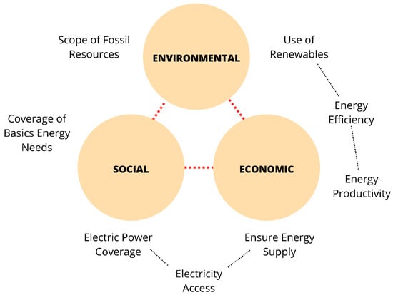 The idea of the interconnections between sustainability dimensions is presented in Figure 1, especially focusing on energy; there are topics that are in more than one dimension, such as electricity access, which has social and economic importance. Each dimension of sustainability has indicators that measure whether the levels of sustainability are being satisfied, and the evaluation and discussion of these indicators are the focus of this paper.