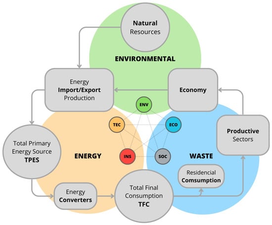 There is a relationship between the dimensions of sustainability and their resources. In Figure 2, the environmental (ENV), economic (ECO), social (SOC), technical (TEC), and institutional (INS) dimensions are placed with their source, and the interconnection between the dimensions is presented in gray. For each of the dimensions, there are indicators that will be further discussed in this section.