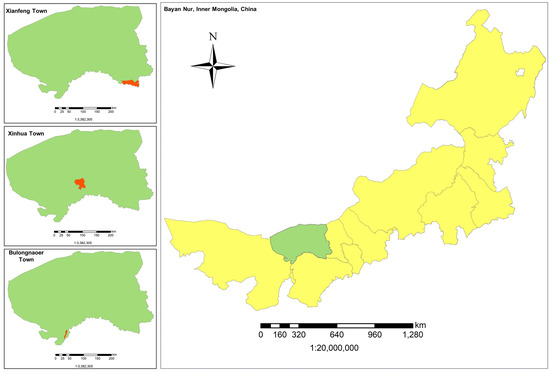 Location of Xianfeng Town (red polygon), Xinhua Town (red polygon), and Bulongnaoer Town (red polygon) in Bayan Nur (green polygon), Inner Mongolia (yellow polygon), China.