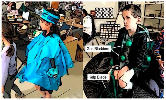 Children wore their costume and role-played as these marine creatures by moving and organizing themselves in ways that represented how they would interact in the kelp forest (Figure 1). For example, a child playing as a sea bass would “swim away” from children playing as larger predators. Similarly, children playing as sea urchins would pretend to “eat” children playing as kelp. The class also engaged in play activities that reflected on how different species move and how they compare to smaller or larger creatures. For example, in one play activity, children pretending to be kelp often proudly stated that, as they are so tall and dense, they can protect and hide fish from being hunted by orcas or sharks. Through embodied role play, children gained a critical understanding of the importance of each sea creature within the ecosystem, no matter how small or large they were.