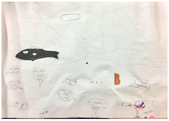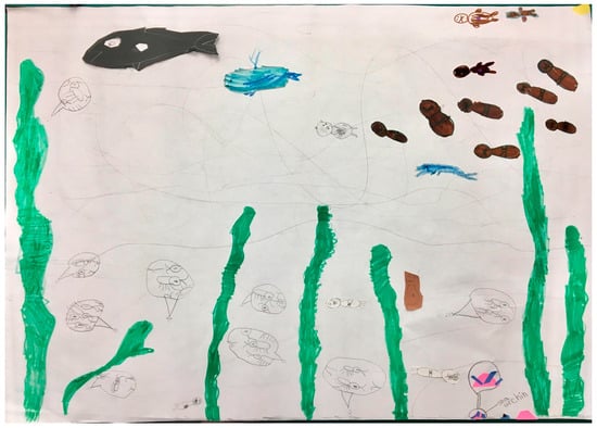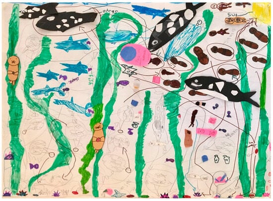 The final collage-making day took place the day after a play-based lesson on how humans impact the ocean ecosystem. The children had extensive conversations on plastics and microplastics and how the decline of one species within this ecosystem would ultimately have effects on the larger food web. In the final collage, we see an abundance of revisions and additions, as the students had ninety minutes to finalize their artwork (Figure 5).