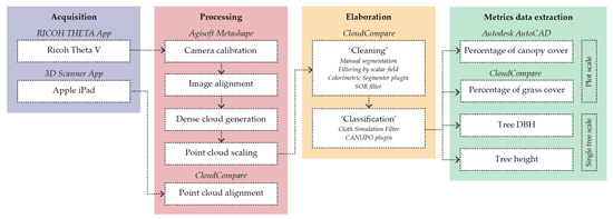 Connecting a wide range of methods (i.e., spherical photogrammetry, point cloud modeling), tools (i.e., 360° camera, tablet with lidar sensor), and software (i.e., Agisoft Metashape version 1.7.0, CloudCompare version 2.12.4, Autodesk AutoCAD version 24.2.53.0), the proposed workflow is defined (Figure 1) and tested in a non-trivial, sufficiently self-contained, real-world applied research exploration: the development of dynamic virtual representations for a plot of the Mesiano University park in Trento (Italy). The result is a 3D digital model that would allow the acquisition of information at micro- (understory vegetation), meso- (single tree), and macro- (urban park or forest) spatial scales.