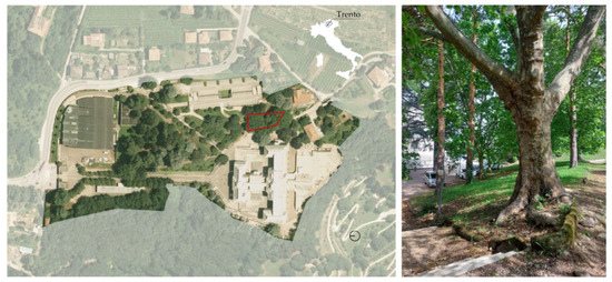 The case study presented for our research exploration is located in the city of Trento (Italy), the capital of the same province, in the eastern Italian Alps. The city lies along the course of the Adige River and, being within a valley, is surrounded by two mountain ranges reaching up to 2000 m asl. Specifically, the study area is located within the park of the Department of Civil Environmental and Mechanical Engineering (DICAM) of the University of Trento, on the east hill of the valley (lat. 46.065231, long. 11.139920). The park covers an area of approximately 25,000 m2 and mainly has conifers and deciduous trees.