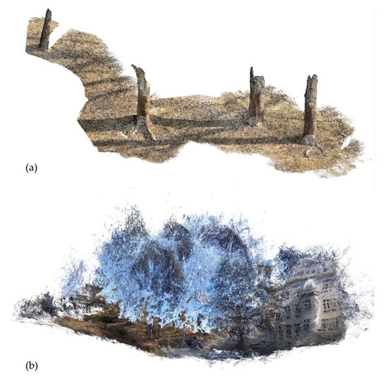Figure 5. Views of the 3D point cloud ‘winter’ model before (a) and after (b) the ‘cleaning’ operations.