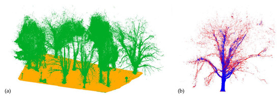 Figure 6. Left (a), results obtained by applying CSF on the entire plot to separate ground points (in orange) and off-ground points (in green); and right (b), results of the classification with CANUPO on tree A to distinguish trunk and main branches (in blue) from secondary branches and leaves (in red).