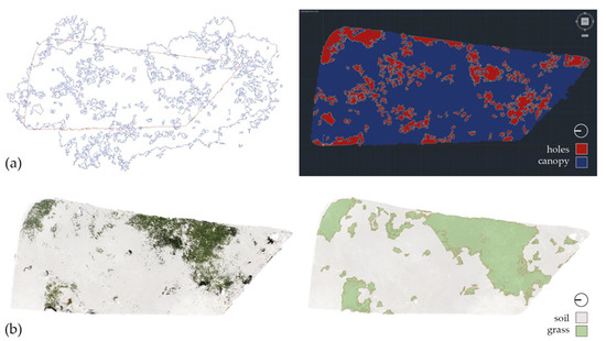 Figure 7. Extraction of parameters from the summer point cloud. Top (a), screenshots for canopy cover estimation: left, the contours of the canopy and plot extracted from CC, and right, estimation of covered and uncovered areas in AutoCAD. Bottom (b), screenshots for grass cover estimation: left, grass points selected with the RGB filter, and right, 2D polygons obtained from the contour of grass areas.