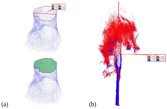 Figure 8. Extraction of parameters from the summer point cloud. Left (a), screenshots for DBH estimation: top, manual acquisition based on the contours of the trunk section, and bottom, mathematical calculation based on surface of the trunk section. Right (b), manual measurements of the tree height.