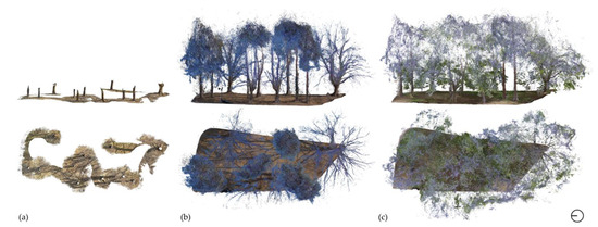 At the end of the described workflow—merging survey and digital modeling disciplines and consisting of three main steps (data acquisition, processing, and elaboration)—two (plus one) virtual reconstructions of the selected plot of the Mesiano University park in Trento were obtained: a 3D point cloud of trees up to a height of about 2 m and portions of the surrounding terrain, in the immediate vicinity of the trunks (Figure 9a); and a 3D point cloud of trees up to their canopy and the entire plot’s soil, for both winter (Figure 9b) and summer seasons (Figure 9c).