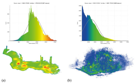 Figure 10. Density of points in a spherical volume of radius 0.50 m: comparison between point cloud from iPad (a) and spherical photogrammetry (b).
