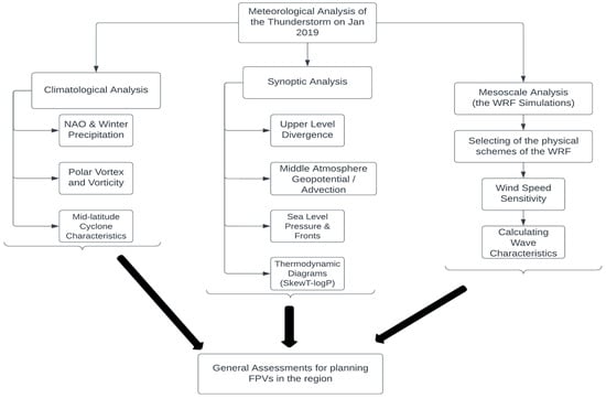 Briefly, meteorological analysis of the thunderstorm event on Antalya in January 2019 was carried out under three main headings. These main headings and subheadings are shown in Figure 2 as a flowchart.