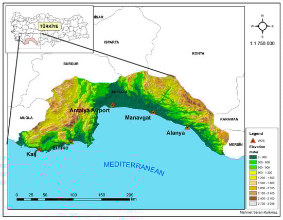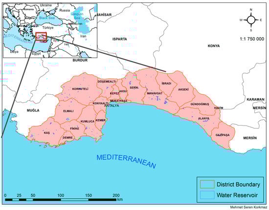 The study area of this research is the administrative borders of Antalya province of Türkiye. The region’s appeal for installing FPVs is enhanced by its developed status in tourism, industry, and agriculture [], besides its significant solar energy potential.