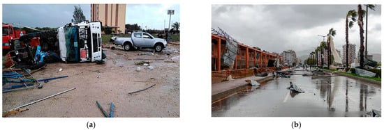 In addition to this research, various studies conducted by different researchers have analyzed the tornado incident, particularly the one observed at Antalya International Airport on 26 January 2019 [,]. However, severe thunderstorm and tornado events are more common, especially in the districts to the west of Antalya. The chosen event in January 2019 caused the death of two people and injuries to seven others [] (Figure 4a,b).