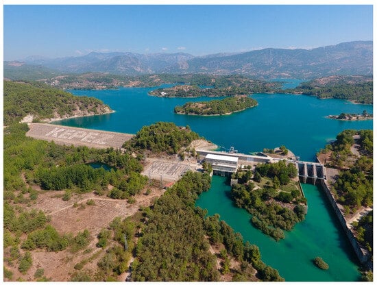The outputs generated after the study, such as calculated wind speeds or wave characteristics, can be utilized for the planned FPV installations in dam reservoirs, while meteorological analysis can be conducted within the administrative boundaries of Antalya province. However, specific information regarding which dams and their sizes has not been finalized by the governmental agencies, for instance, the water reservoir of Manavgat Dam (Figure 5), a hydroelectric power plant located to the east of Antalya, which would be a highly suitable site for this purpose. Similarly, there are numerous dams in Antalya. Therefore, with the obtained outputs and the method employed, calculations can easily be performed for any dam reservoir.