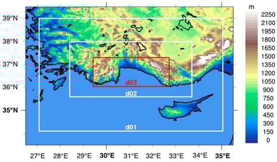 From the perspective of mesoscale analysis, the WRF state-of-the-art NWP model is used to simulate the thunderstorm events that occurred in January 2019. The WRF model comprises a range of physics schemes []. Three nested domains with horizontal resolutions of 9 km, 3 km, and 1 km are arranged from the outermost to the innermost domain, respectively. The central point of the domain is located at 36.60° N and 31.05° E (Figure 7). The innermost domain covers the province of Antalya and some neighboring areas. The simulations span eight days, starting from 00:00 UTC on 23 January 2019, with the first day considered as the “spin-up” period. Output data have temporal resolutions of 180, 180, and 15 min for the outer, middle, and innermost domains, respectively. Additionally, the ERA5 re-analysis dataset is used for initial and boundary conditions in the model simulation, with 3 h intervals.