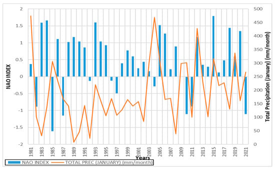 In addition, it is valuable to consider the impact of North Atlantic Oscillation (NAO), a global atmospheric circulation pattern, on the precipitation originating from the Mediterranean and occurring in the region in terms of synoptic climatology. Detailed research on this subject reveals that a positive NAO index leads to decreased winter precipitation, particularly on the western coasts of the Anatolian peninsula during winter months []. Our analysis generally confirms the mentioned pattern. However, remarkably high precipitation amounts in January 2019 were observed [], despite being in the positive phase of the NAO index (Figure 8). The main reason for this anomaly might be the heavy rainfall that occurred in the Western Mediterranean starting on 22 January and affecting the region until 27 January. As such, these rainfalls were highly influential in terms of the intensity of precipitation in January.