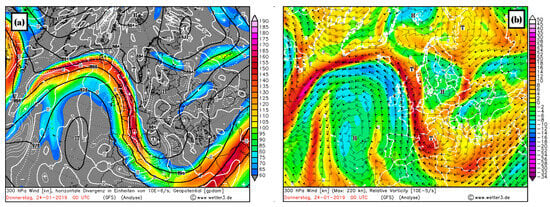 300 hPa jet streams (kn, shaded), geopotantial height (gpdam, black contours) and horizontal divergence (10−6/s, white contours) (a); relative vorticity (10−5/s, shaded) and wind (kn, wind bars) (b) over the Europe on 24 January 2019, 00:00 UTC (retrieved from wetter3.de (accessed on 20 December 2022)).