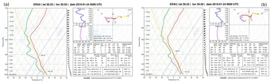 SkewT-logP thermodynamic diagram of 24 January 2019, 00:00 UTC (a) and 06:00 UTC (b) near Antalya (retrieved from www.rawinsonde.com (accessed on 20 December 2022)).