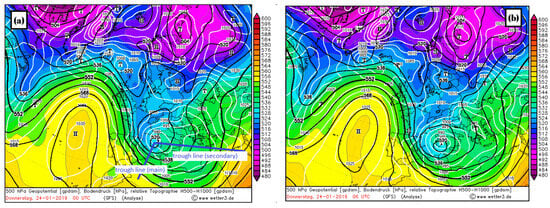 500 mb geopotential height (gpdam, shaded), surface pressure (hPa, white contours) and geopotantial height thickness between 1000 hPa and 500 hPa (gpdam, black contours) over the Europe on 24 January 2019, 00:00 UTC (a) and 06:00 UTC (b) (retrieved from wetter3.de (accessed on 20 December 2022)). Thick and blue lines show main and secondary trough lines.