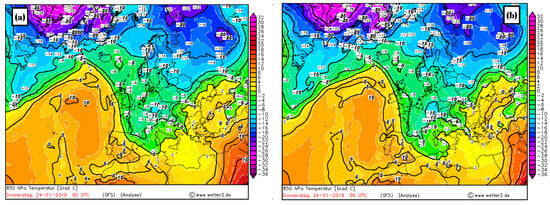 850 hPa temperature (°C, shaded area and contours) over Europe on January 24, 2019, 00:00 UTC (a) at 06:00 UCT (b) (retrieved from wetter3.de (accessed on 20 December 2022)).