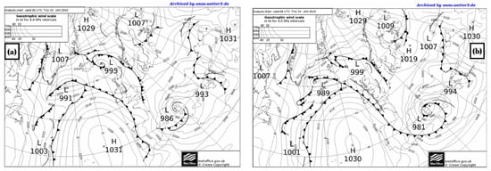 The website wetter3.de/archive (accessed on 20 December 2022), where the weather charts for various atmospheric vertical levels produced by the German Weather Service (DWD in German abbreviation) are archived and presented freely online, is used for synoptic analysis. In addition, mean sea level atmospheric pressure and frontal charts produced by the MetOffice of the United Kingdom also take place in the same web site. These charts are applied for the frontal analysis of the storm.