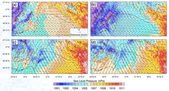 Consistent with findings from prior research [,,] using both climatological and synoptic approaches, the considered study area is susceptible to the influence of mid-latitude cyclones originating in the Western Mediterranean and progressing eastward. Additionally, cold-core cyclones can form over the Aegean Sea during the winter season.