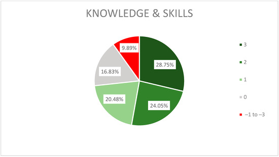 In addition, based on Q-SV, Figure 2 shows that 28.75% of the students claimed that they had received knowledge and skills relevant to SDG 8 to a great extent (Q-SV = 3), 24.05% for Q-SV 2 and 20.48%. for Q-SV 1, which resulted in a total of 73.38% of the students indicating that they had a positive perception of the extent to which they had gained knowledge and skills relevant to the SDG 8. However, 16.83% were neutral and 9.89% of the students claimed that they either did not gain knowledge and skills about SDG 8 or only did so to a limited extent. In addition, although it seems that, based on the students’ perceptions, most of the students claimed that they gained knowledge and skills through the teaching of their courses, the results show that the gains in skills that improved system thinking, anticipatory thinking, and normative thinking were limited. The Q-SV of these skills was almost negative or neutral across the three factors.