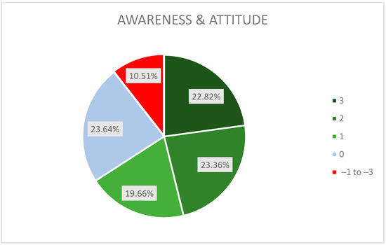 Table 5 presents the distinguishing statements for the awareness and attitudes theme for Factors 1, 2, and 3 for each of the 14 statements. The results show that 13 statements were statistically significant for Factor 1, 9 statements for Factor 2, and 9 statements for Factor 3. Therefore, there were significant differences across the students’ perceptions regarding the extent to which ABS courses increased their awareness and attitudes toward the principles of SDG 8. Factor 1 shows that the students’ perceptions are negative in terms of how their studies at ABS affected their awareness and attitudes toward SDG 8. Both Factors 2 and 3 show that student perceptions are mixed between positive and negative but are, overall, closer to the negative direction. This negative direction is also shown in Figure 3; in terms of Q-SV, 48.8% of the students claimed that they had negative perceptions of how ABS courses enhanced their awareness of and attitudes toward the targets and principles of SDG 8.