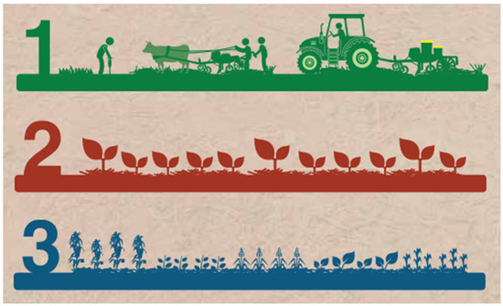 Figure 1 presents the three interrelated principles of (1) conservation agriculture: minimization of soil mechanical disturbance; (2) effectiveness of permanent organic cover of the soil; and (3) diversification of species.