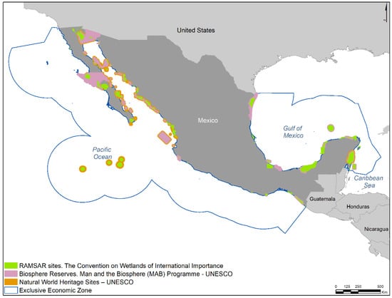 The high level of biodiversity in Mexico, at all three levels (genes, species, and ecosystems), has resulted in a wide variety of landscapes of great scenic beauty [12], which has contributed to the recognition of many Mexican sites by international organizations such as UNESCO. These sites, along with others of global importance from different countries, are included in the List of Wetlands of International Importance (Ramsar List), the World Network of Biosphere Reserves of the MAB Program and the List of World Heritage Sites. The international recognition of these areas, proposed by the Mexican government, places them as priority areas for conservation. By proposing this recognition, the Mexican government has assumed the responsibility of preserving them and maintaining the values that made this recognition possible in the first place.