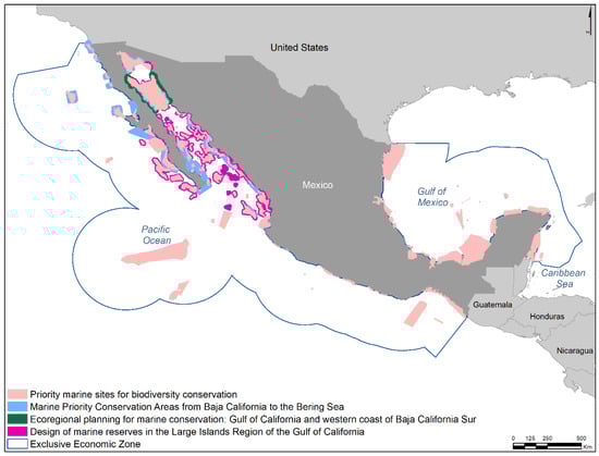 Planning exercises carried out in Mexico to identify priority areas for marine conservation: (1) priority marine sites for biodiversity conservation [21]; (2) Marine Priority Conservation Areas from Baja California to the Bering Sea [22,23]; (3) ecoregional planning for marine conservation: Gulf of California and western coast of Baja California Sur [24]; and (4) design of marine reserves in the Large Islands Region of the Gulf of California [25].