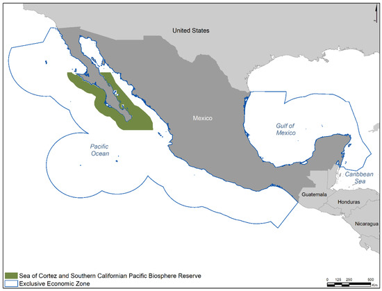 Mexico is a megadiverse country, with three-quarters of its territory being marine [13]. The Territorial Sea (234,317 km2 or 23,431,700 ha) and the Exclusive Economic Zone (EEZ) (2,879,678 km2 or 287,967,800 ha) belong to the Mexican marine zones under federal jurisdiction [14]. The latter comprises the strip of the sea measured from the outer limit of the territorial sea to a maximum distance of 200 nautical miles offshore, counted from the baseline from which the width of the territorial sea is measured. The inner limit of the EEZ coincides identically with the outer limit of the Territorial Sea [15]. The Mexican coasts extend for 12,022 km (8210 km in the Pacific Ocean, 2268 km in the Gulf of Mexico and 1544 km in the Caribbean Sea), for which the conservation of marine and coastal areas is a national priority [16].
