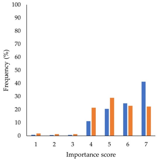 The interest in food traceability is becoming increasingly important for consumers during purchase. The fish sector, especially for the processed species (frozen, canned, refrigerated, etc.), has a very long and complex supply chain [25]; therefore, as highlighted by other authors, receiving information regarding fish traceability can improve individuals’ trust, make consumers aware of this topic, and finally push them to buy tracked alternatives instead of untracked ones [26,27]. Furthermore, since fish is a highly perishable food [40,41], receiving detailed information about traceability can help consumers when purchasing, reducing food scares, but can also help food companies managing food-related issues (recalls of non-conforming products, problems related to specific production batches) [26]. The results of this study showed that it is important for Italian respondents to receive information about the traceability of the purchased fish species. On the contrary, for Spanish respondents, traceability information is less taken into account during the purchase. As shown in Figure 1, 41% of Italian respondents assigned a score of 7 on the 7-point Likert scale, while in Spain, only 22% of respondents assigned the same score. Our results are consistent with another study that reported that Spanish consumers have a lack of knowledge about fish traceability, so it is not a factor that is taken into account when purchasing fish products [40]. Moreover, it was found that in order to improve awareness of traceability, it is both important to educate respondents about the practice and also to make traceability reporting more prominent on packages so that it is more easily visible and recognizable [42]. Applying ANOVA (one-way ANOVA and Duncan test, p ≤ 0.05), statistically significant differences between the two countries were found (p ≤ 0.05). Therefore, in response to research question one (RQ1) formulated above, it could be concluded that for Italians, it is important to receive information on the traceability of purchased fish species, whereas for Spanish respondents, this information is not of key importance at the time of purchase.