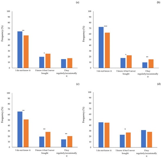 Sustainability label knowledge in Italy and Spain: ASC (a), BAP (b), FOS (c), MSC (d). ■ Italy (963), ■ Spain (954). Asterisks indicate significant differences (* p < 0.05; ** p < 0.01; *** p < 0.001).