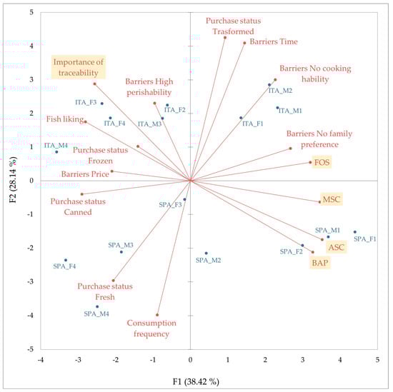 Table 5 reports the correlation between variables and factors. Figure 3 is a representation of the respondents on the first two dimensions extracted by PCA accounting for 66.56% of the variance (38.42% PC1; 28.14 PC2). Respondents were well separated in terms of provenance and age; indeed, Italian respondents are located in the upper part, while the Spanish respondents are located in the lower part of the graph; additionally, the younger respondents are located in the right part, while the adults are in the left part of the graph. Figure 3 allows one to observe the variables which characterise the respondents and the associations among them. The results showed that adult Spanish respondents consume fresh fish more frequently than Italian ones; indeed, as reported in another study [27], Spain is among the top nations in fish consumption in Europe. On the other hand, adult Italian respondents have shown a greater liking for fish products compared to Spanish respondents, and they also buy more frozen fish and perceive the high price and the high perishability as a fish-consumption barrier. Actually, it is well established that fish consumption is beneficial to health, but the recommended daily intake is not widely achieved, and this is due to fish-consumption barriers [48,49,50]. As reported by other authors [21,22,23], fish price is the main barrier to consumption frequency. Although the price increase is often interpreted as signaling better quality, [51] reports that the increase in the price of fish products reduces the willingness of consumers to buy these products or to buy them in smaller quantities. Regarding the high perishability, fish are highly perishable food products due to their composition, which involves a series of chemical and microbiological reactions that take place from the post-catch phase until final consumption; this phenomenon is called autolysis [33,40,41]. Thus, the tendency to buy frozen products may be due to the perceived barriers among Italian adults. Such products, unlike fresh products, receive minimal processing treatment (cutting, filleting, removal of non-edible parts, and, finally, wrapping), so they also come with more information than fresh fish products. This could justify the Italian respondents’ greater interest in fish traceability compared to Spanish respondents, who, by buying more fresh fish, are more used to receiving less information about what they buy and are therefore better able to self-identify the characteristics of the purchased species. However, some fraud may be related to the provenance and freshness of the species purchased [25,52], so it would also be advisable to disseminate strategies to raise awareness of fish traceability to direct purchases toward this category of products and reduce the probability of any kind of fraud.