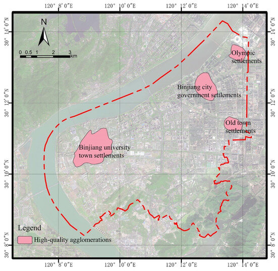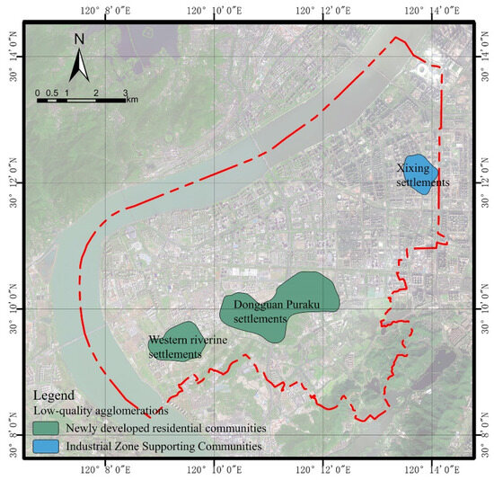 To analyze the spatial clusters of high-quality residential environments in the Binjiang District, several spatial distribution characteristics were identified in Figure 5. Areas surrounding Binjiang University Town, the administrative government area, the Olympic Sports Center area, and the Gudun area exhibited the most significant and extensive concentrations of high-quality residential environments. These areas formed a belt-shaped cluster along the river. The key driver behind this spatial distribution pattern is the inclusion of various functional centers, such as political, educational, cultural, and sports facilities. Thus, essential services for the daily life of residents are prioritized and concentrated in these areas, leading to economies of scale. The spatial clusters of low-quality residential environments in the Binjiang District can be categorized into three types, as shown in Figure 6. Firstly, there are newly developed residential areas along the western riverfront and the Dongguan Pule residential area. Although they have relatively good infrastructure and higher levels of residential and environmental quality, these areas are situated far from the city center, resulting in transportation inconveniences. Moreover, these areas predominantly focus on residential functions with poor supporting public service facilities and infrastructure. Therefore, the overall residential environment quality remains relatively lower. However, these areas play a crucial role in accommodating the decentralization of central urban functions and population, making them a priority for optimizing the allocation of urban public services and improving public transportation. Secondly, industrial-area-associated residential communities, primarily represented by the Xixing residential area and scattered smaller neighborhoods, exhibit specific characteristics. These communities are built close to industrial enterprises and predominantly cater to the housing needs of industrial workers. The supporting facilities in these areas are primarily designed to serve industrial production and have not fully considered the residents’ quality of life. Furthermore, these communities with longer histories of development are located far from the city center, facing transportation challenges. Lastly, there are areas characterized by resettlement housing, including the Dongguan area and certain neighborhoods near the university town. These areas accommodate low-income residents and individuals affected by land acquisition in suburban areas. The residential areas in these locations have a single function and suffer from a remote location, transportation inconveniences, and a lack of comprehensive supporting service facilities. At present, they are on the relative edge of urban areas and need to be considered comprehensively in the context of rapid urban development.