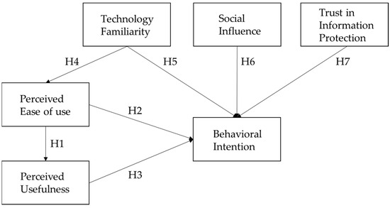 As the original TAM primarily addressed technology use in unavoidable everyday situations, such as the workplace, it may not fully capture users’ intention to use technology in voluntary scenarios [82], prompting researchers to question its adequacy (e.g., [82,83]). TAM has also been criticized for its limitation in capturing psychological factors arising from the technology-using process [84]. To enhance the model’s predictive power, additional variables have been proposed [62]. Thus, to better understand airport users’ intention to use the biometric system and increase the model’s explanatory power, this study incorporated three external variables, namely technology familiarity, social influence, and trust in the information protection capability of airports, based on the related literature, which is particularly relevant to the context of the biometric recognition system [54,85,86].