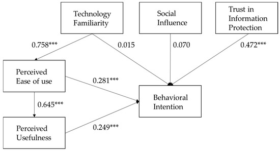 The structural equation model analysis was performed to test the hypotheses. The model demonstrated goodness of fit statistics in their acceptable ranges [122]: χ2 = 273.968 (df = 97, p = 0.000); GFI = 0.954 (recommended >0.900); χ2/df = 2.946 (recommended <3); CFI = 0.980 (recommended >0.950); NFI = 0.970 (recommended >0.900); RMSEA = 0.058 (recommended <0.080); RMR = 0.067 (recommended <0.080). These model fit indicators demonstrated a good fit for the research model. The path analysis results are summarized in Table 4. The result showed that H1 is supported (β = 0.645, p < 0.01) and it means that if travelers feel free to use the biometric system at an airport, they are more likely to perceive the usefulness of the system. Perceived ease of use positively affected usage intention (β = 0.281, p < 0.01) and perceived usefulness also had a positive relationship with usage intention (β = 0.249, p < 0.01), supporting the H2 and H3. These results suggest that travelers are more likely to accept the airport biometric system when they recognize that the system can efficiently support their airport task and is not difficult to use. In terms of external variables, technology familiarity had a positive effect on perceived ease of use (β = 0.758, p < 0.01) but it did not have a statistically significant impact on acceptance intention (β = 0.015, p = 0.775). Therefore, H4 was supported while H5 was not supported. In addition, the impact of social influence on intention to use was not statistically verified in this study (β = 0.070, p = 0.065) and it rejected H6. This result revealed that social influence is not a consideration when a traveler determines whether they use the airport biometric system. Finally, trust was confirmed as the greatest motivator to accelerate the traveler’s intention to use the biometric system (β = 0.472, p < 0.01) and it supported H7. This result indicated that the trust of tourists must be considered to increase the intention to use the biometric system. The finalized research model is depicted in Figure 2.