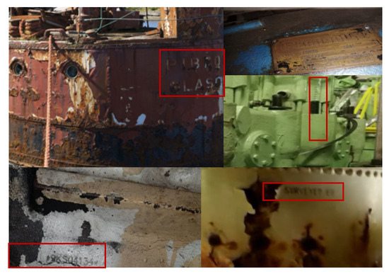 The datasets used in this study covered various imprinted characters, including digits 0–9 and 13 alphabets: A, C, D, E, I, L, M, N, O, P, R, S, and T. These characters were obtained from old or poorly maintained ships (Figure 1). These images were carefully selected, to support ship character identification and retrieval systems. Within the context of our research, the presence of a relatively small dataset encompassing only a few alphabets (13) introduces the potential risk of exacerbating mode collapse in the GAN used for data augmentation [33]. This concern informed our strategic decision to concentrate on a specific subset of characters (13 of 26 alphabet characters). Despite this limitation, we hold a strong belief in the broader applicability of our results and conclusions. The images exhibited variations in size and color, but they were preprocessed, to ensure consistency during training and analysis. Specifically, they were normalized to grayscale and resized to 56 × 56 pixels in width and height. The images were stored in standard formats, such as JPEG or PNG. The dataset encompassed various engraving styles commonly found on ships, including embossed, engraved, and painted characters, either individually or in combination. These characters represented ship identification numbers, hull markings, engine component identifiers, and other characters relevant to ship operations. This comprehensive approach enabled us to capture the diversity and complexity of the characters found in real-world ship components. By evaluating the classifiers’ performance on both digit and alphabet datasets, we could identify any variations in recognition capabilities and gain a comprehensive understanding of their effectiveness.