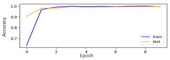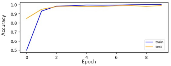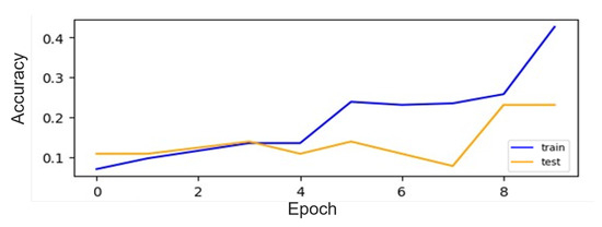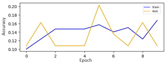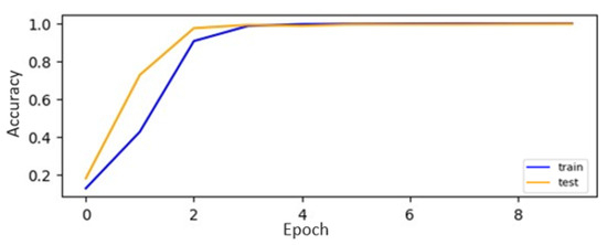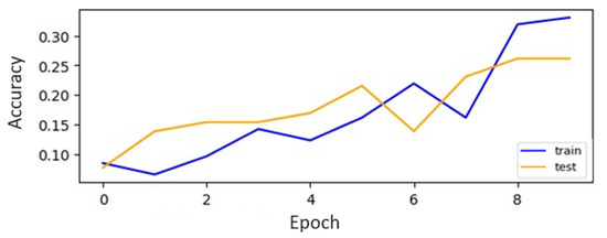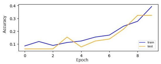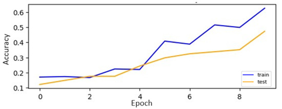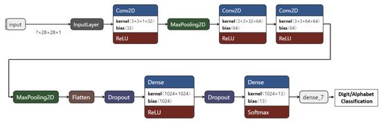 As shown in Figure 4, the CNN-ISC architecture comprises three Conv2D layers, each followed by a ReLU activation function, to introduce nonlinearity. The first Conv2D layer has 32 filters with a 3 × 3 kernel, and the subsequent two Conv2D layers have 64 filters with 3 × 3 kernels. These convolutional layers are responsible for capturing the low-level and high-level features in the input images. After each Conv2D layer, a MaxPooling2D layer with a 2 × 2 pooling size is applied, to reduce the spatial dimensions of the feature maps. This step helps reduce computational complexity and focuses on the most salient features. A flatten layer is added, to transform the 2D feature maps into a 1D vector, preparing the data for the fully connected layers. Two dropout layers are inserted into the architecture, to prevent overfitting. The first dropout layer randomly drops out 50% of the neurons after the flatten layer, and the second dropout layer has the same dropout rate and comes after the first dense layer. The CNN-ISC architecture also includes two dense layers. The first dense layer has 1024 neurons with a ReLU activation function and is followed by L2 regularization, to further prevent overfitting. Finally, the output layer is a dense layer with 13 neurons using the softmax activation function. This allows the model to perform multi-class classification for the 13 alphabets. For digit recognition, we modified the dense layer to 10, corresponding to digits 0–9. The model was compiled using a learning rate of 0.001.