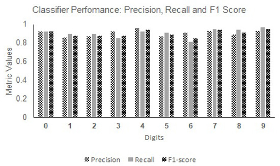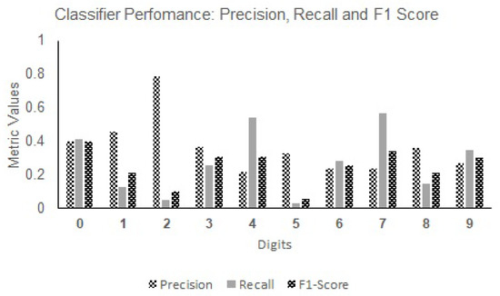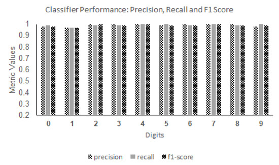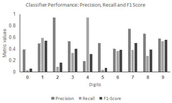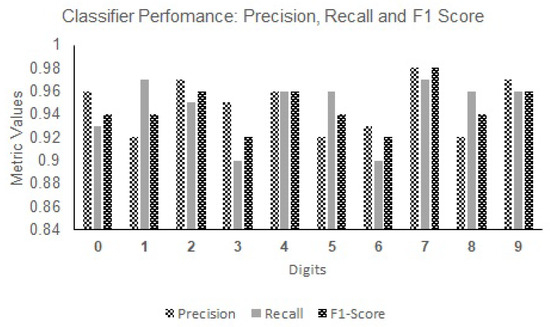 Digit 4 consistently demonstrated one of the best performances across various classifiers, with high F1 scores. For instance, the KNNs classifier (Figure 5) excelled in recognizing digit 4, achieving an impressive F1 score of 96%, showcasing its ability to accurately classify positive samples while minimizing FPs. Similarly, in the SVMs classifier (Figure 6), digit 4 achieved the highest F1 score of 94%, indicating accurate classification with well-balanced precision and recall. However, some classifiers faced challenges in recognizing certain digits. Figure 7 shows the performance of the RF classifier. RF struggled with digits, and the SGD classifier in Figure 8, although achieving relatively lower overall F1 scores, performed relatively well for digit 9. These findings provide valuable insights for selecting suitable classifiers and designing effective digit recognition models for various applications.