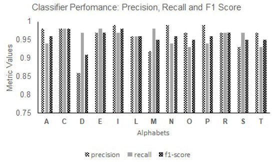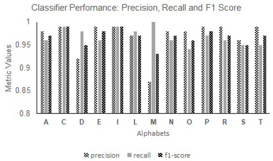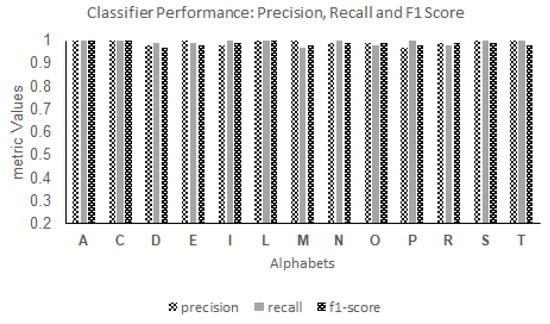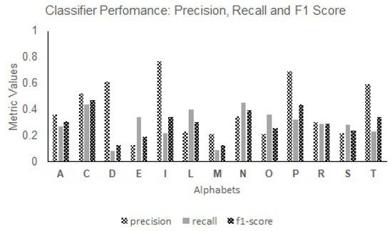 For the alphabets, the letters “C”, “P”, and “I” consistently achieved high F1 scores across various classifiers, including SVMs (Figure 9), KNNs (Figure 10), and GNB (Figure 11). These letters showcased excellent recognition capabilities, with F1 scores ranging from 0.43 to 0.99. Conversely, the letters “E”, “S”, and “R” exhibited relatively lower F1 scores across the classifiers, indicating the need for further optimization in classifier models, to improve their recognition accuracy. The F1 scores for these letters ranged from 0.19 to 0.97 across the KNNs, SVMs, SDG, DT, and GNB classifiers. The variations in performance highlight the impact of different classifiers on recognizing specific alphabet characters.