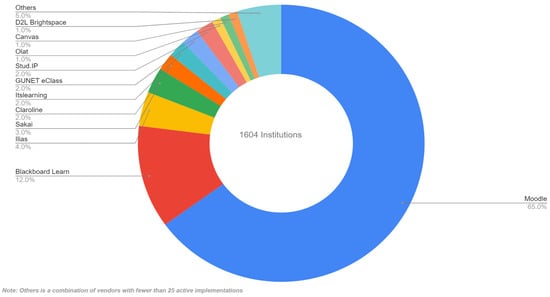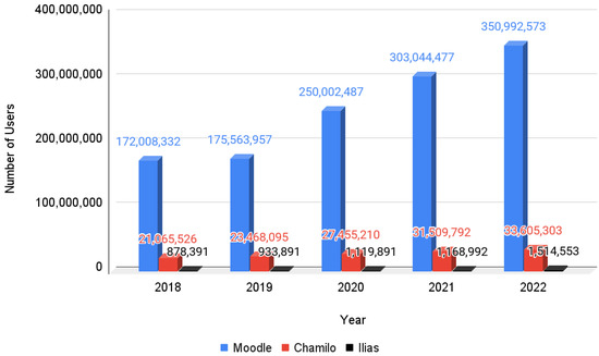 Before the pandemic, the e-learning industry was already growing, with an investment of USD 18.6 billion in 2019 and a predicted global budget of USD 350 billion by 2025. E-learning software systems, or learning management systems (LMSs), such as Moodle, Chamilo, and Ilias, have gained significant traction as shown in