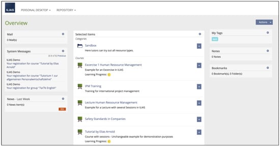 Figure 5) is a flexible environment for online learning beyond the traditional concept of courses. It can be compared to a library of learning resources that can be made available to non-registered users. Ilias includes three primary working areas: personal desktop, repository, and administration. The personal desktop provides customizable elements, such as system messages, news, calendar, and bookmarks. The repository allows users to create and save various learning resources. The administration section provides access to administrative settings for all features and objects in the system. Ilias is an open-source LMS that can be easily installed, configured, and tailored to meet specific needs [