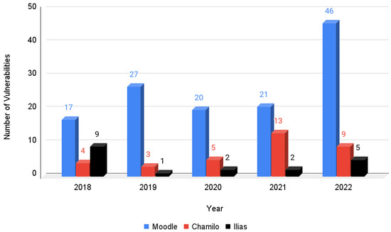 Post-COVID-19 (2022), a significant surge in the number of vulnerabilities was observed across all three platforms. Notably, Moodle stood out with the highest number of vulnerabilities identified, totaling 46. Conversely, Chamilo and Ilias had significantly fewer vulnerabilities during this period, with, respectively, nine and five identified.