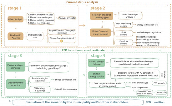 The methodology follows a multi-step process (Figure 1) in which the different facets of the transition to a PED [7] are analyzed. Once the district is selected, the methodology is used to first perform an urban analysis of the environment of the district, followed by a climate and bioclimatic analysis to adapt the solutions to its climatic and urban characteristics (Stage 1). Subsequently, the energy demand of the district in the current situation is calculated (Stage 2) to identify passive proposals for demand reduction (Stage 3). Then, the potential energy balance and surplus generated by the active strategies implemented in the PED transition scenario are estimated (Stage 4).