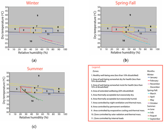 The aim of the ACC is to support the determination of site-adapted passive strategies to improve the performance of buildings and mitigate the urban microclimate of the district. This climograph for the definition of the comfort zones is based on the local population (genetic footprint), the climate of the site, the thermal insulation of clothes, the metabolic activity of the users, the indoor temperature of the building surfaces and the internal loads (equipment use, occupancy, and activity) [30]. The result of this combination of data is a climograph indicating two comfort zones and other zones indicating the passive strategies necessary to achieve the comfort state of the users.