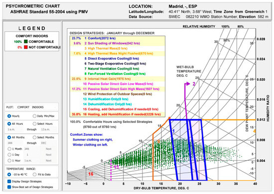 Climate Consultant 6.0 [31] is commonly used in the climate analysis of a site for passive building design. This tool is based on climate data from Energy Plus Weather (EPW) [32]. The results of these combinations of data define a psychrometric chart in which a set of passive design strategies can be identified with the number of hours they have to be used to achieve indoor comfort. Another result of this tool is the definition of a list of design guidelines and actual passive strategies applicable to the analyzed area [33]. These strategies will improve the performance of the buildings in the different seasons and optimize the well-being of the inhabitants.