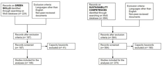This study compares two different research topics: one related to sustainability competences, and the other to green skills. The aim is to provide an overview of the peer-reviewed literature in the interdisciplinary databases. Scopus and Web of Science (WoS) were identified as the largest interdisciplinary databases for the peer-reviewed literature, spanning different countries around the world. We only considered the literature in English. We excluded Scopus because we wanted to compare different disciplines such as Education, Psychology, and Social Sciences, but in Scopus, these fields are amalgamated in the general area of Social Sciences. WoS distinguishes between Education, Social Sciences, and other research fields, which was important to define the conceptual structure of green skills and sustainability competences.