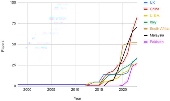 4.2. Countries, Associated Collaboration Networks, and Production over Time by Country